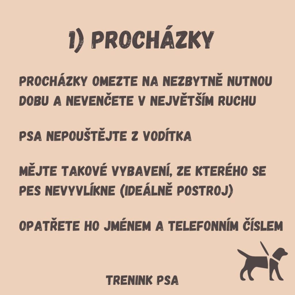 Procházky omezte na nezbytně nutnou dobu a nevenčete v tom největším ruchu – pokud o to Váš pes nestojí, nenuťte ho do zbytečně dlouhých procházek.
