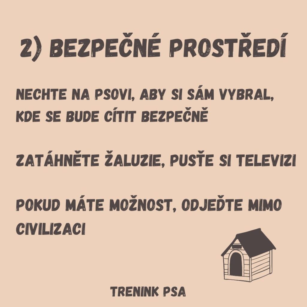 Nechte na psovi, aby si sám vybral, kde se bude cítit bezpečně – někteří psi budou zalezlí v boudičce, jiní vyhledávají koupelny. Když bude chtít být s Vámi, poskytněte mu oporu a buďte s ním.